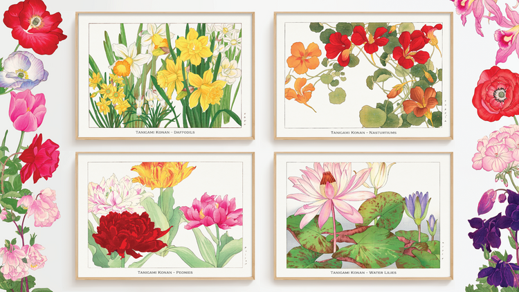 A specially curated collection of stunning Japanese woodblock flower prints by the talented artist Tanigami Konan, who came to Europe to capture our most beautiful blooms – reproduced as museum-quality giclée art prints. These Japanese floral prints look fabulous on modern walls.