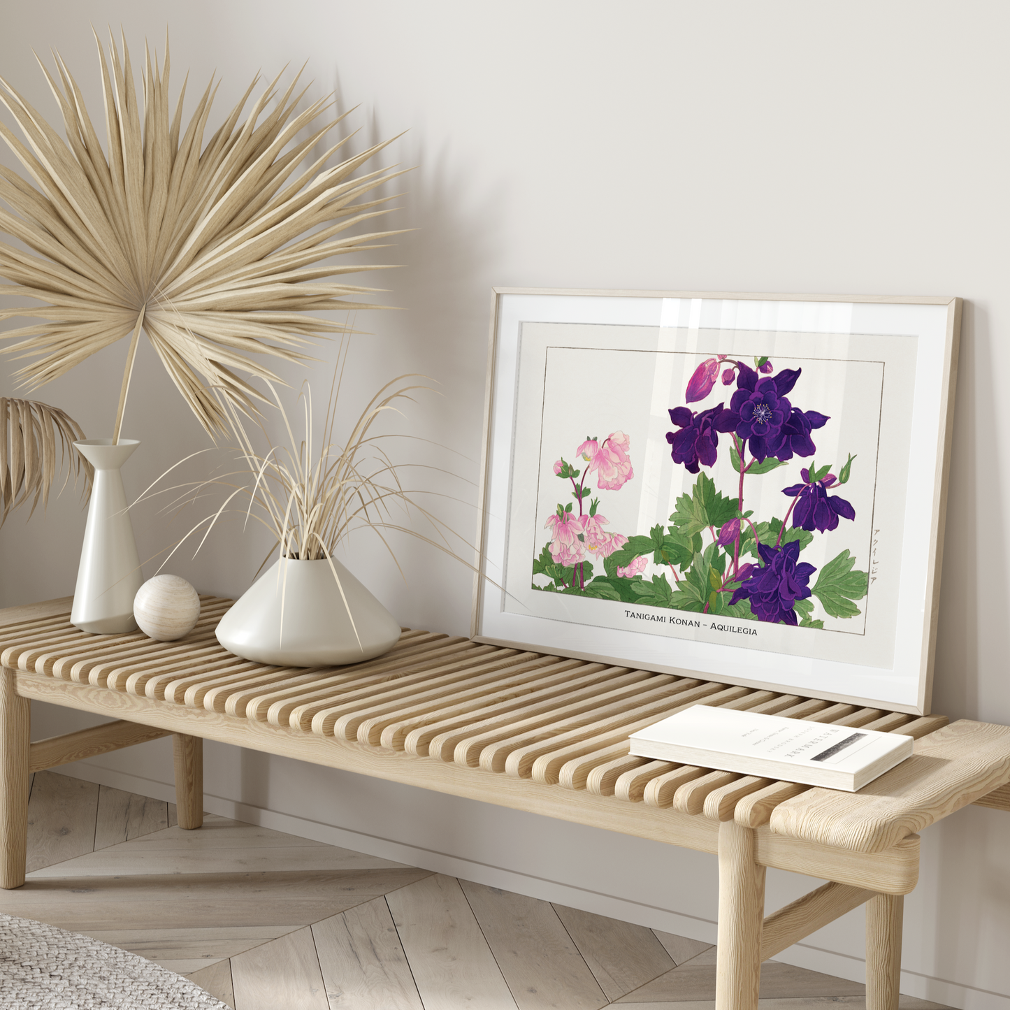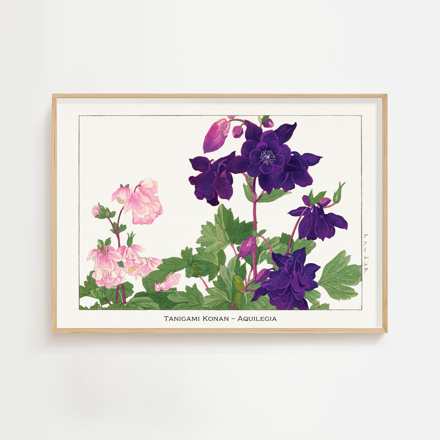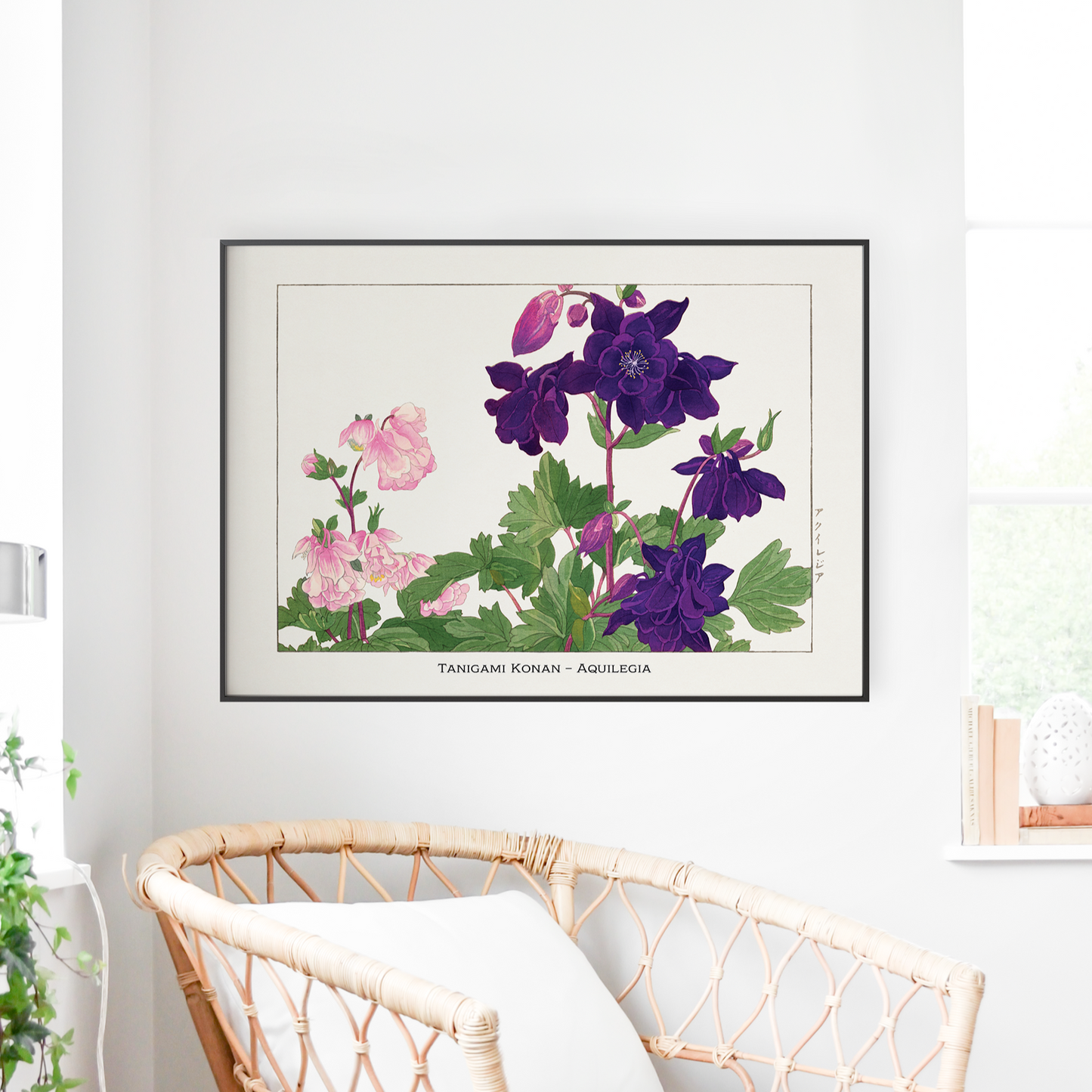 Beautiful Aquilegia flowers wall art print by Japanese woodblock artist, Tanigami Konan.