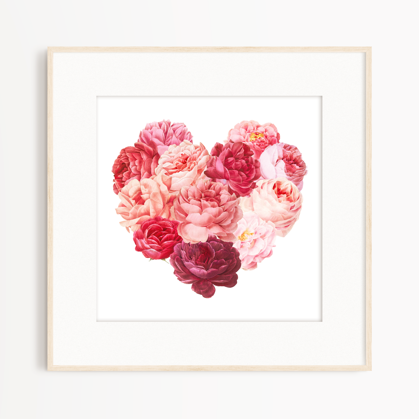 This unique wall art print features a cluster of gorgeous red and pink rose watercolour illustrations arranged in the shape of a heart.